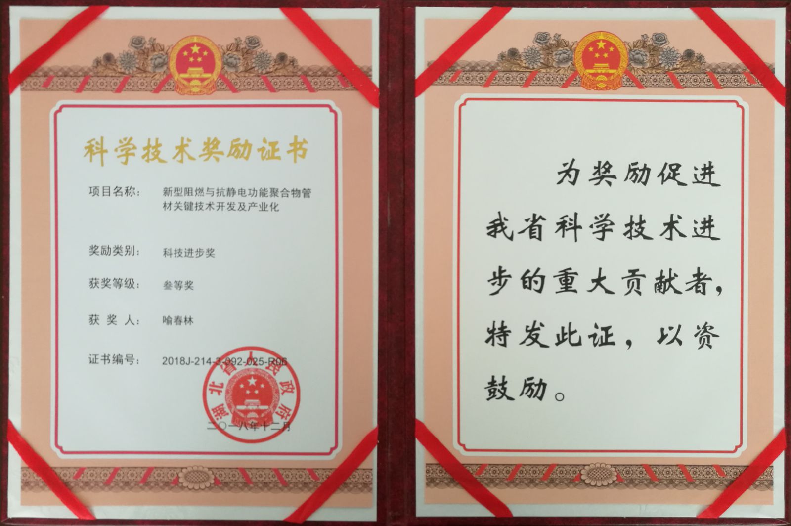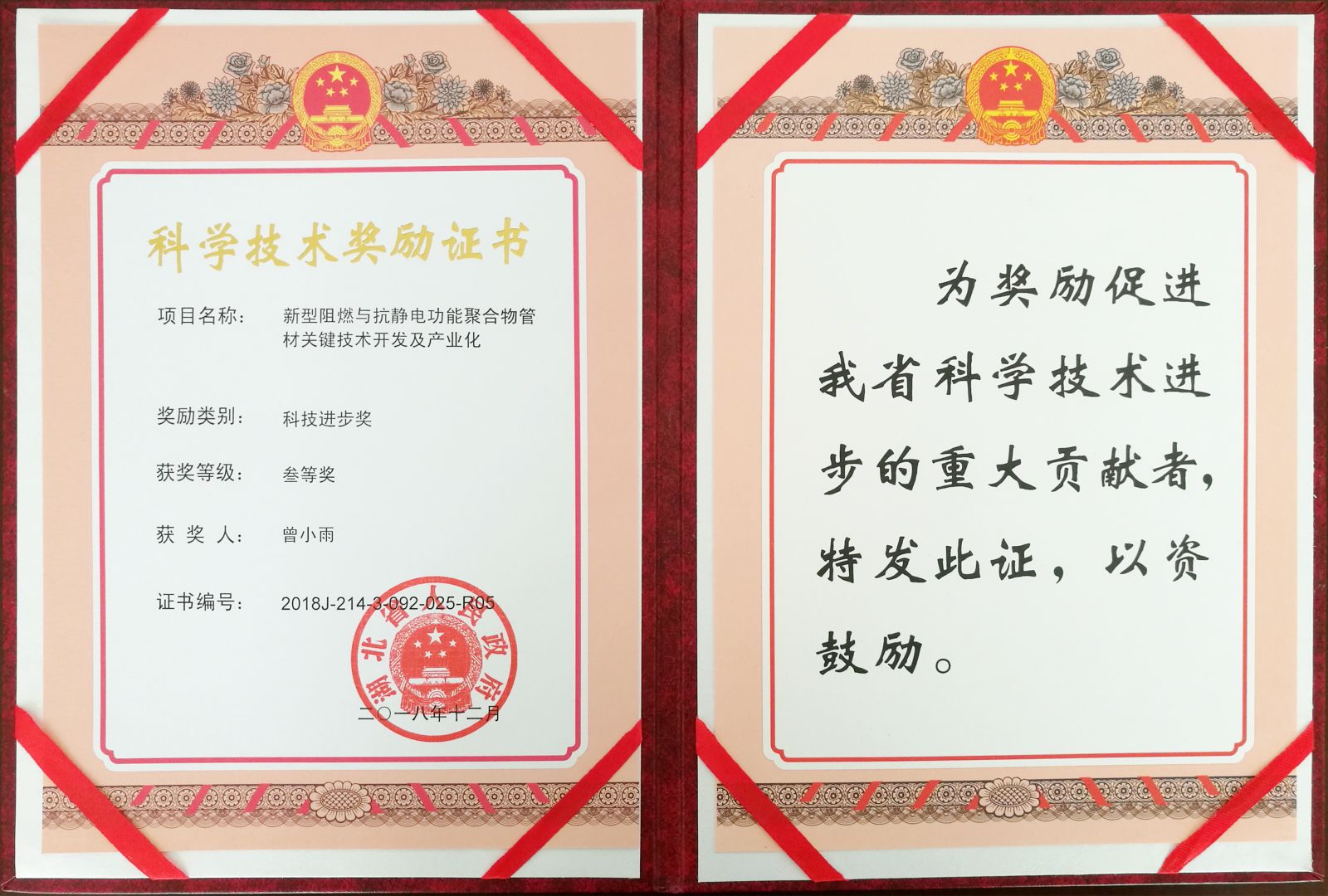我司新型阻燃與抗靜電功能聚合物管材關(guān)鍵技術(shù)開發(fā)及產(chǎn)業(yè)化項目榮獲湖北省科技進步叁等獎。