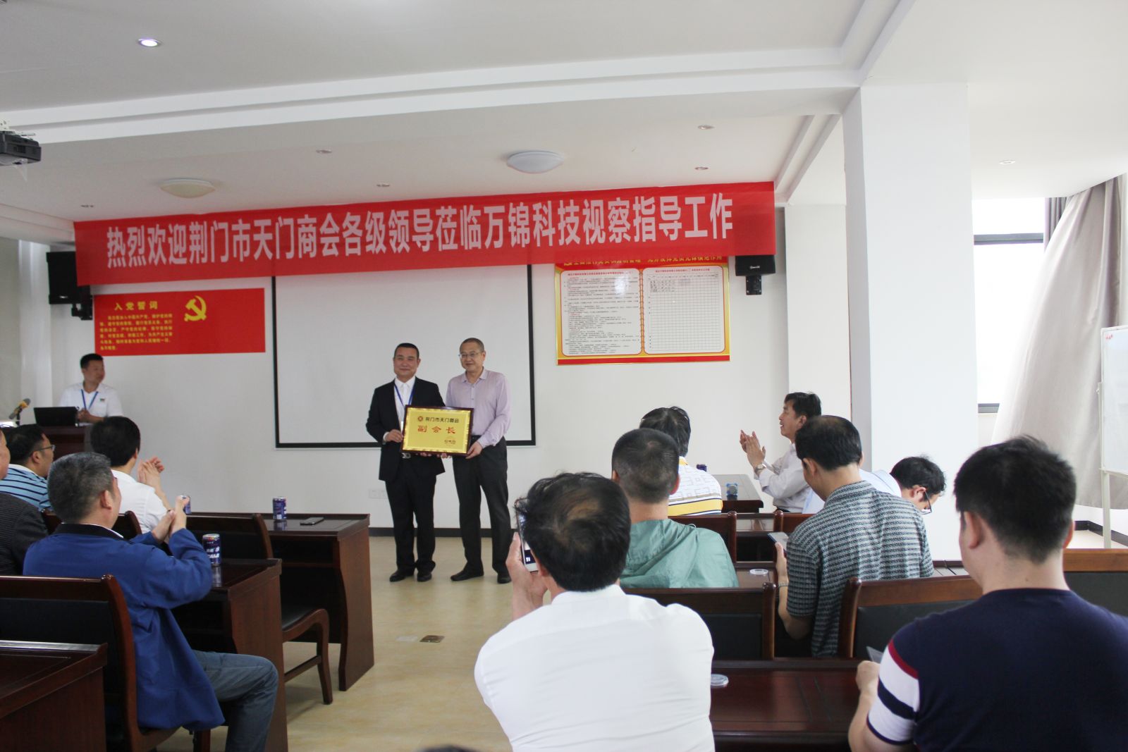 荊門市天商聯(lián)合會(huì)會(huì)長(zhǎng)馬懷義向萬錦科技董事長(zhǎng)夏祥義同志頒發(fā)了荊門市天商聯(lián)合會(huì)副會(huì)長(zhǎng)牌匾。