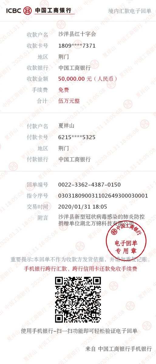 2020年1月31日,萬錦科技向沙洋縣紅十字會捐贈專項沙洋縣新型冠狀病毒感染防控資金5萬元人民幣。