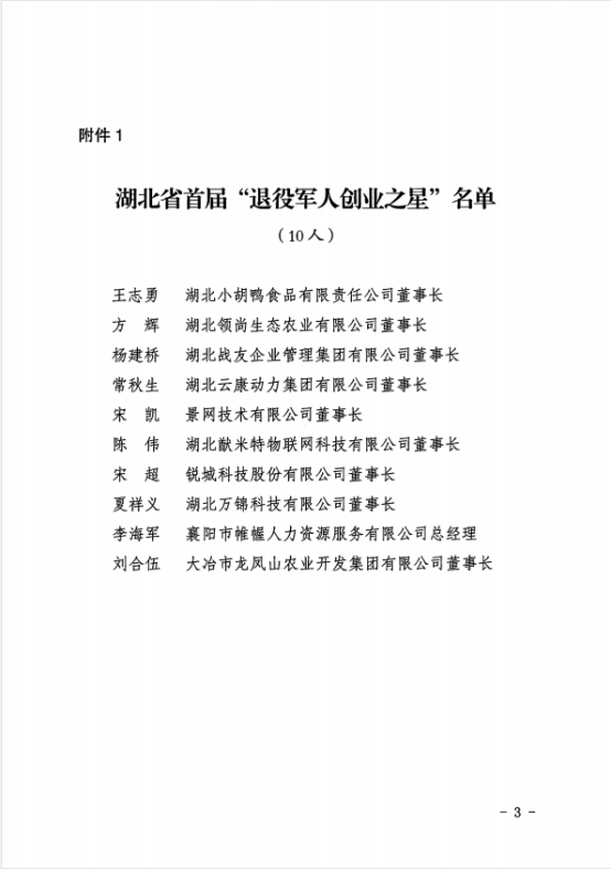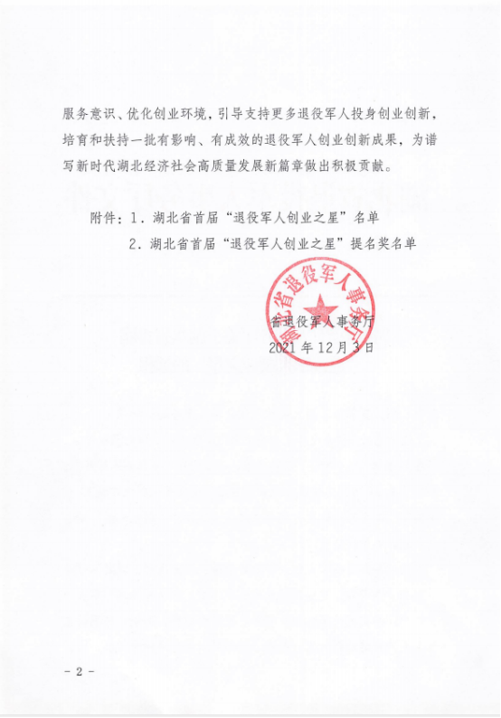 12月8日,經(jīng)過縣、市層層審查推薦、省組織專家評(píng)審,我司董事長(zhǎng)夏祥義被湖北省退役軍人事務(wù)廳評(píng)為湖北省首屆“退役軍人創(chuàng)業(yè)之星”。