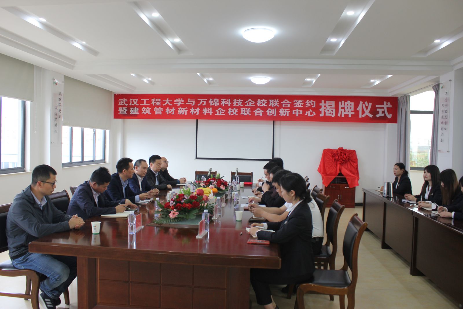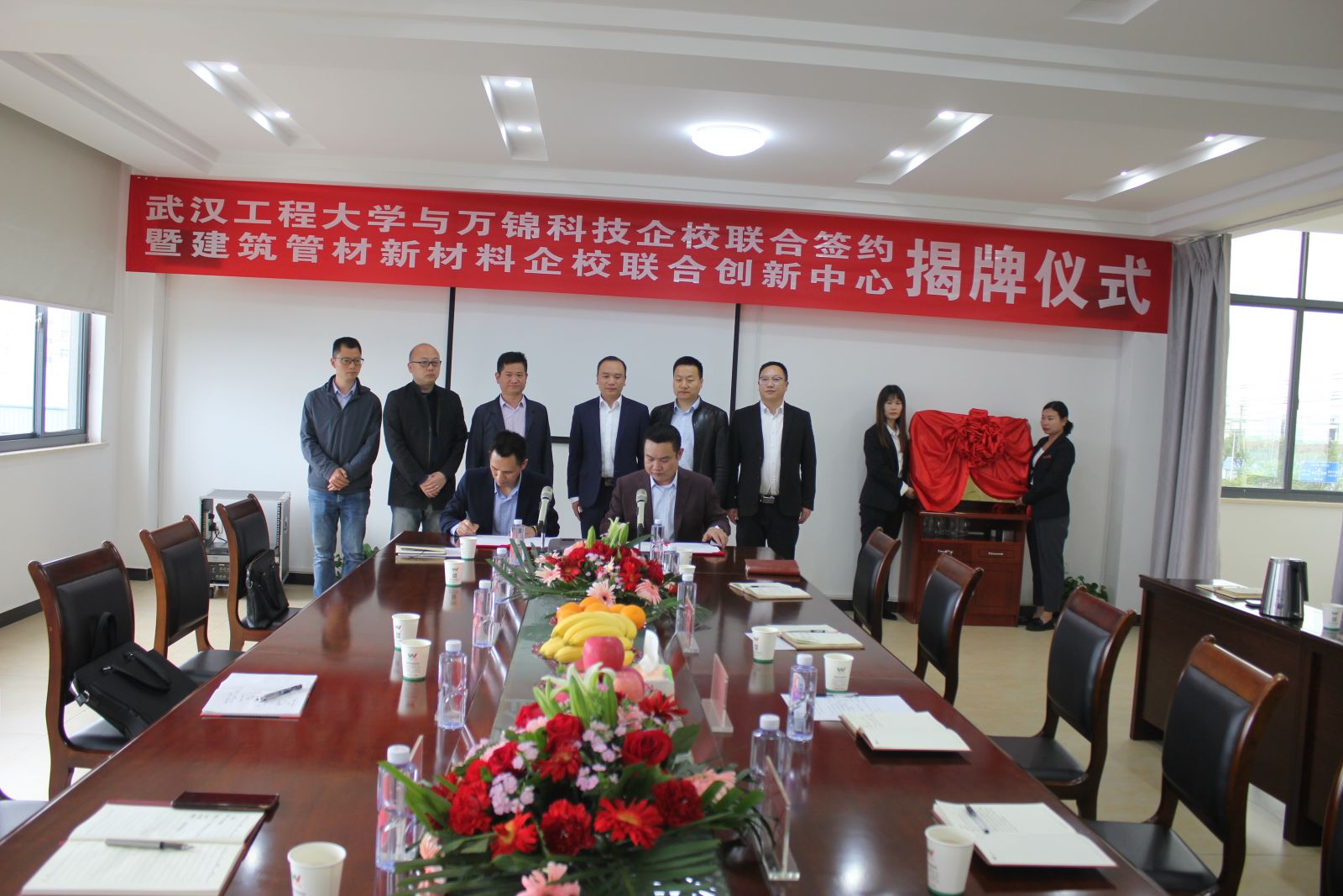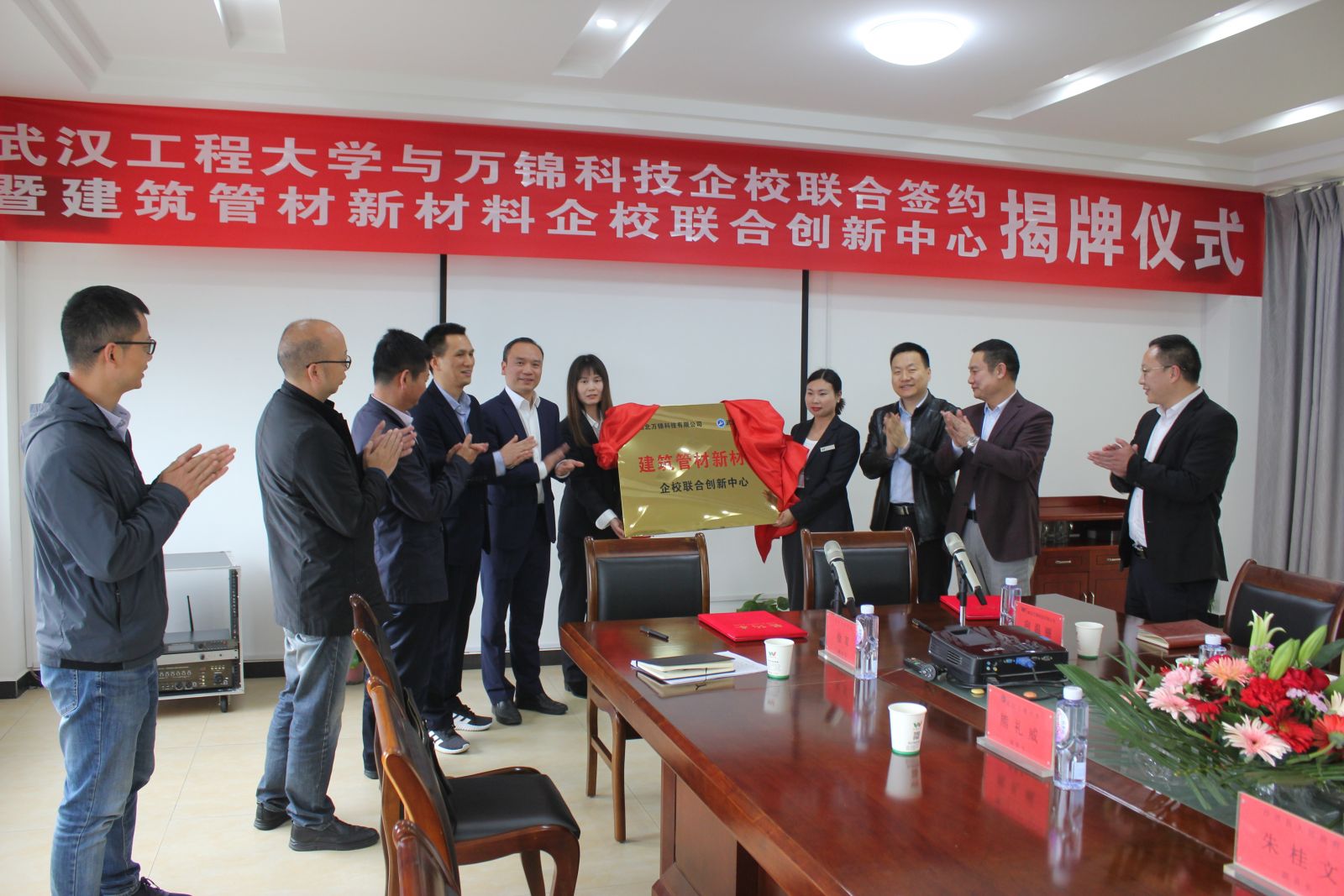 4月28日,湖北萬(wàn)錦科技有限公司與武漢工程大學(xué)企校合作簽約暨建筑管材新材料企校聯(lián)合創(chuàng)新中心揭牌儀式在我司隆重舉行。武漢工程大學(xué)材料學(xué)院副院長(zhǎng)熊禮威 、教授杜飛鵬、老師張?jiān)骑w;沙洋縣人民政府副縣長(zhǎng)朱桂文、沙洋縣科經(jīng)局黨委書記肖華峰、沙洋縣科經(jīng)局副局長(zhǎng)徐軍;公司相關(guān)部門負(fù)責(zé)人出席簽約及揭牌儀式。