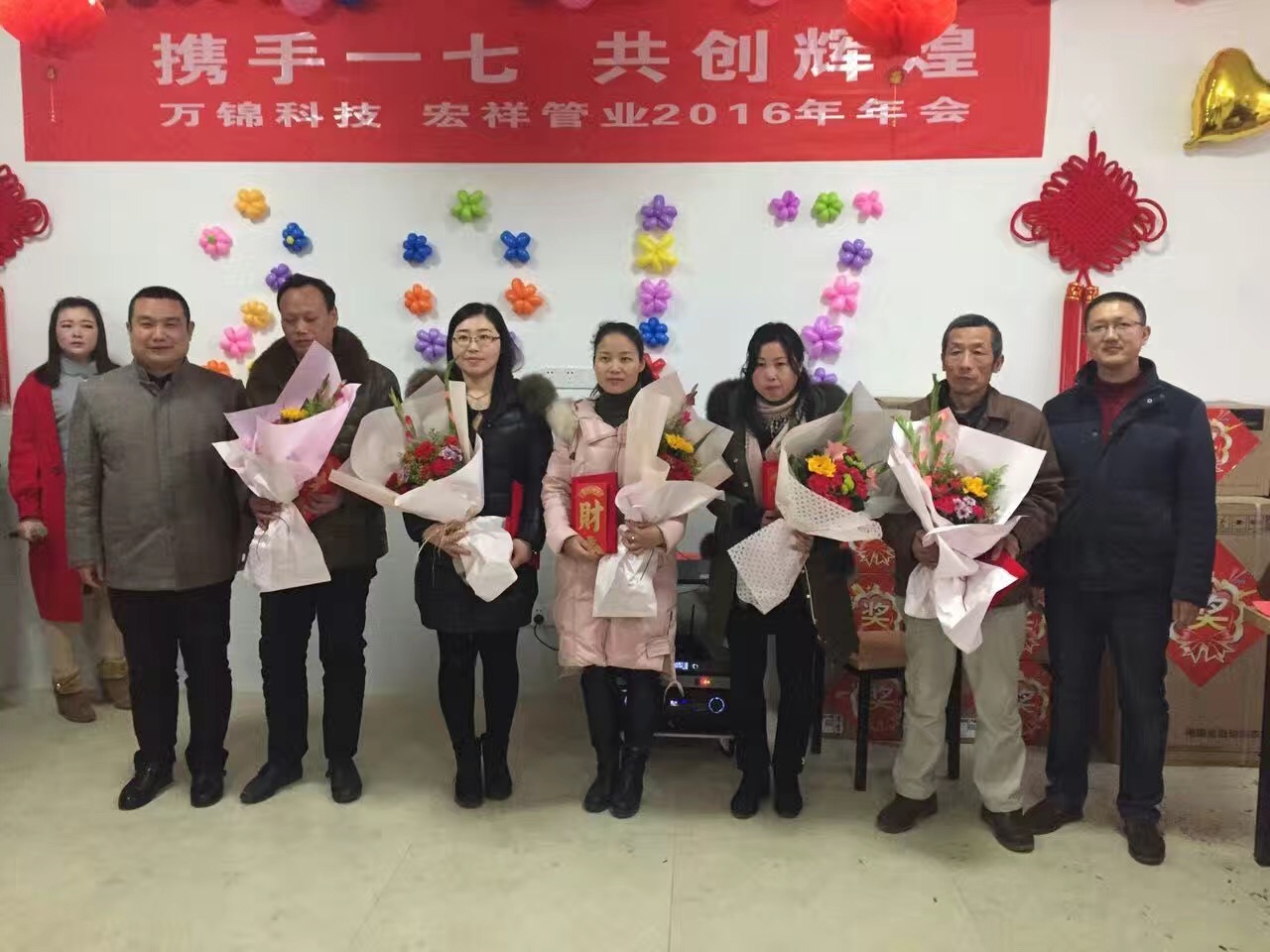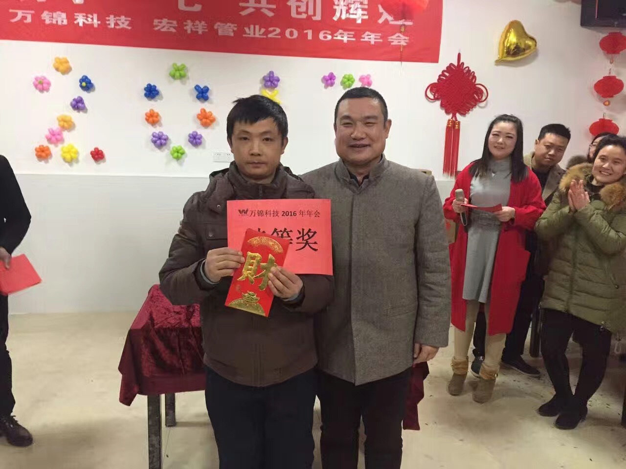 2017年1月18日,萬錦科技舉辦了“攜手一七 共創(chuàng)輝”2016年聯(lián)歡晚會,晚會開始前,兩位主持人組織到場人員進行了各項小游戲,并對優(yōu)勝者頒發(fā)了歡樂獎;晚會第二項由公司副總經(jīng)理、財務(wù)總監(jiān)饒林香女士宣布了2016年度生產(chǎn)標兵和優(yōu)秀員工,集團副總吳國安先生為生產(chǎn)標兵的優(yōu)秀員工頒發(fā)了榮譽證書,集團董事長夏祥義先生為生產(chǎn)標兵和優(yōu)秀員工頒發(fā)了現(xiàn)金紅包獎;晚會第三項進行了部門精英挑戰(zhàn)賽,依次由副總經(jīng)理、財務(wù)總監(jiān)饒林香女士;副總經(jīng)理、生產(chǎn)總監(jiān)張艷平;宏祥管業(yè)生產(chǎn)總監(jiān)陶建明;營銷總監(jiān)高陽新代表四個部門進行2017年工作任務(wù)表態(tài)發(fā)言;晚會第四項集團董事長夏祥義先生致辭;晚會第五項進行了幸運大抽獎,抽取了特等獎1名,獎品為現(xiàn)金2888元;1等獎2名,獎品為現(xiàn)金1888元;2等獎3名,獎品為小天鵝洗衣機1臺;3等獎10名,獎品為美的微波爐1臺;晚會第六項年會晚宴,晚宴結(jié)束后對到場人員進行了新春禮品發(fā)放。